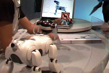 ERS-7はまずピンクの棒に反応する。でも、そのときクローバー型の模様が見えていたら、それは棒に対して正対していないと判断し、模様が見えなくなるところまで自分の位置を動かす(あるいはアイボーンを蹴飛ばす)。そうして正対したら棒をくわえるのだ。また、最初にアイボーンが立っていたら、まず蹴飛ばして横倒しにしてから始めるのだそうだ(実際にやるところを見損ねた)。