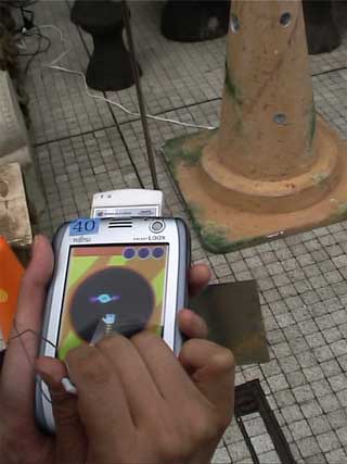 きょろきょろすると、少し先の角に、水玉パイロンがある。行ってみると、その脇に巨大パイロンが立っている。ああ、これかぁ(*4)。PDAに水玉パイロンの情報を入力すると、「やったぁ」のメッセージが表示されて、いよいよ捕獲作業開始。