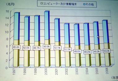2006年までのコンピュータ本体の需要は、国内需要がIT投資促進税制の効果やオープンソースOS採用促進などで2005年からプラスに転じると予測。サーバ・ワークステーションは、台数ベースではプラス成長だが単価ダウンによって金額ベースでは減少傾向が続くとし、回復の兆しが見え始めたPCがサーバ・ワークステーションの落ち込みをカバーするカタチになるとJEITAでは見ている。