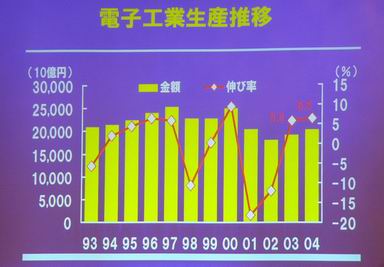 昨年一昨年の大幅落ち込みから3年ぶりにプラスに転じた背景として、アジア向けの輸出改善と、デジタル家電を牽引役にしたデジタル機器の増産体制があげられる。一部では、2004年の後半に景気が後退すると予測もでているが、JEITAでは、電子工業の生産は2004年もプラス成長を継続するとの見方を崩していない。
