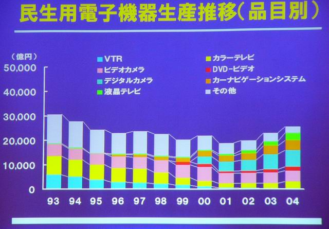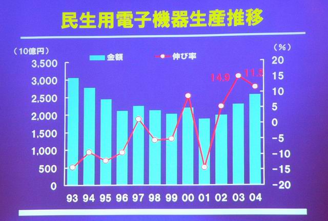 民生用電子機器は、従来型製品の海外生産が進む一方で、高機能で価格も高いデジタル機器が大幅な伸びを示している。これらの高機能デジタル機器も海外に生産をシフトすると見られているが、JEITAでは本格的な以降を2005年以降と予測しており、2004年も引き続きプラス成長すると考えている。