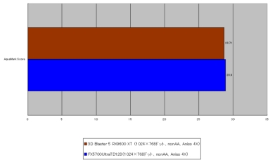 さらに気になるのが、同じGPUを搭載しているR9600XTと比較してもRX9600 XTのベンチマーク結果が下回っていること。とくにR9600XTで優勢だったDirect X 9.0系のベンチマーク「AquaMark03」の値が、RX9600XTでは、FX5700 Ultra TD128を下回る結果になっている。