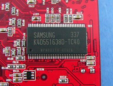 評価機に搭載されていたビデオメモリ「K4D551638D-TC40」。スペック的な最高クロックが250MHzなので、PowerStripでRADEON 9600 XTの定格300MHzに設定するのはかなり危険(ほとんど無理)と思われるこの遅いメモリクロックが、RX9600 XTのベンチマーク結果が意外と低い値にとどまっている原因であることは想像に難くない。それでは、なぜ定格よりも遅いメモリクロックとなっているのだろうか。