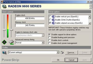 念のためPowerStripでコアクロックとメモリクロックを調べてみると、デフォルトの状態でコアクロックは定格の500MHzを示していたが、メモリクロックは定格の300MHz(DDRデータ転送レートで600MHz相当)を大きく下回る250MHz(DDRデータ転送レートで500MHz相当)の値を示していた。