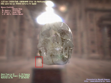 下の2枚の画面は、Masaki Kawase氏によるHDRレンダリングデモ(http://www.daionet.gr.jp/~masa/)をRADEON9500以上とGeForce FX系で動作させた結果だ。なお、DeltaChromeやVolariの結果も実質的にはGeForce FX系の結果と同じになる。このデモは非常によくできていて、動作させたハードウェアに適したHDRレンダリングモードを選択する設計になっている。RADEON9500以上では「D3DFMT_A16B16G16R16」が使えるので、これを使って正しいHDRレンダリングを行う。一方、GeForce FX系ではDirect X 9で新設されたバッファが使えないために、上記で説明したようなDirect X 8世代の「D3DFMT_A8R8G8B8」を使ったHDRレンダリングを行う。