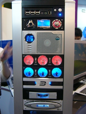 いまショップで注目の派手な3連メーターを供給しているCoolerMasterは、「でかい」ボリュームメーターを取り付けたPCケース「Cavalier」を一押ししていた。一つしかない大きなアナログメーターはブルーのLEDで光り輝くボリュームインジケータ。3連メーターほどの派手さはないものの「これはAVを楽しむホームシアターPCのためのケース。音楽を聴くときは派手なメーターは邪魔になるでしょ」(CoolerMasterアカウントマネージャー ジョディ・チェン氏)