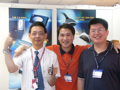 中央に写っているウィルソン・テイ氏が「よーし、俺が規格をクリアさせて日本で売ってみるよ」と張り切っていたので、そのうちショップの店頭で見かける可能性あり。じつはこの3人とも別なブースのスタッフ。五日間も一緒に並んでいるとこんな感じで「お友達」になってしまうのが小規模ブースの面白いところ。大手ブースのようにライバルをけん制する雰囲気とはずいぶんと違うようだ