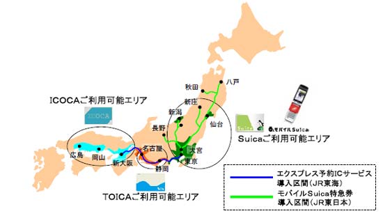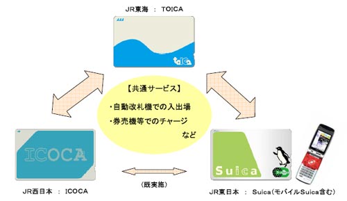 JR東日本のSuicaとJR西日本のICOCAはすでに相互利用が行われているが(2004年4月の記事参照)、これに加えてJR東海発行のTOICAも相互利用が可能になる(2006年7月の記事参照)。なお、カードタイプだけでなく、おサイフケータイで利用できるモバイルSuicaも同様に、TOICA・ICOCAエリアで利用できるようになる。