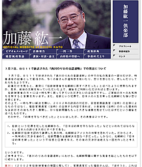 自民党の加藤紘一元幹事長が「拉致被害者5人を北朝鮮に返すべきだった」とテレビ番組で発言し、批判を受けた問題で、加藤氏が公式サイトで経緯を説明して釈明した。「発言の一部だけが報じられたが、前後の文脈を知っていただいた上で趣旨をご判断いただければと」とし、詳細な発言内容を掲載している。