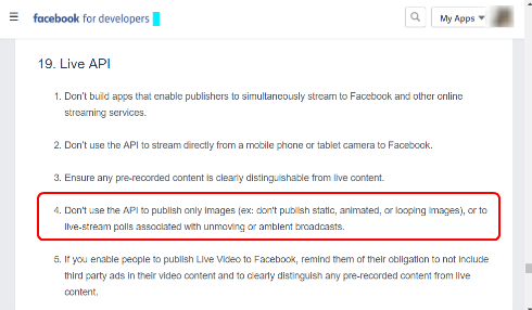 ポリシーの19条「ライブAPI」に「ライブAPIを、静止画だけ、あるいは配信に関連する投票に使ってはならない」という項目を追加した(本稿執筆現在、日本語版にはまだ追加されていない)。