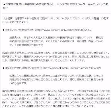 ヘルスケア大学をめぐっては、以前監修を手伝っていたという医師の桑満おさむさんが、「内容に間違いや不正確な点がある」と、具体的な記事をあげてたびたび指摘。5月20日付けのブログでは、膀胱炎に関する記事の誤りを多数指摘した。また、リッチメディアの社長や社員とも数回にわたって面談し、「間違った情報は健康被害の原因になる。いったん閉鎖すべき」と提言したが「走りながら、精査して訂正する」との回答だったとしている。