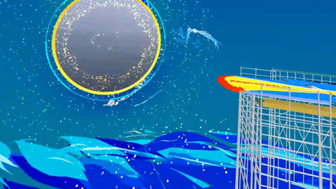 動画視聴インタフェースには、VRコンテンツクリエイターのVoxelKei氏が開発した「SpatialGate」を採用した。VR空間に浮かぶ球体をコントローラーで選ぶと、別のVR空間への“ワープホール”が出現。移動先ごとに異なるVR動画が楽しめる。SpatialGateをOculus Goで体験できるアプリは、鳥人間コンテストVRが初としている。