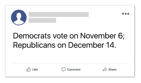 選挙までの期間、有権者を抑圧するような行為に対するポリシーの範囲を拡大する。2016年の大統領選挙では、例えば投票期日や投票場所についての偽情報(下図は例)を削除したが、中間選挙ではさらに、投票方法や投票の有効性についての偽情報も削除する。