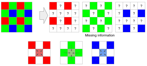 一般的なイメージセンサーは「ベイヤーフィルター」といわれるカラーフィルターを用いることで、「赤色光の写真」「青色光の写真」「緑色光の写真」を同時に撮影し、重ね合わせることでカラー写真を得る。ベイヤーフィルターの配列は左上から右下へ順に「緑、赤、青、緑」という正方形のパターンで、各色に1ピクセルが対応するため、例えば青色を記録するピクセルの位置に来る、赤や緑の光データは記録されない。