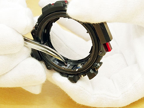 裏ぶたと密着する位置に取り付けられていたO(オー)リングと呼ばれるゴム製のパーツをピンセットを使って取り外す。このチューブ状のパーツがウォッチ内部の気密性を高めるためには欠かせないという。側面に配置されているボタンも、竜頭と同じように蹄鉄型のリングで固定されているので、先にこれを外してからボタンを引き抜く。
