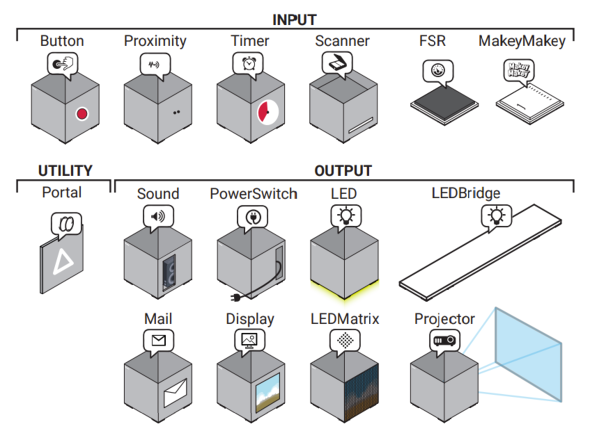 各モジュールには機能を付与できる。プッシュボタン、近接センサー、タイマー、スキャナー、圧力センサー、さまざまなモノをキーにできるMakey Makeyなどを入力機能としてカスタマイズが可能。