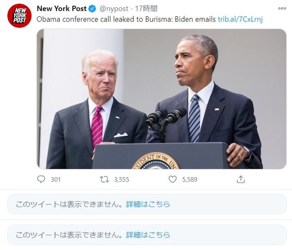TwitterはNew York Postの公式アカウントが投稿したこの記事のリンク投稿を非表示にした。