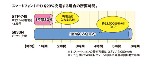 新製品の「STP-748」は4本の単三形アルカリ乾電池を入れ、ケーブルをつなぐとスマートフォンを充電可能。スターリングの検証によると、空のバッテリーを23%まで回復させるのにかかった時間は1時間半。一方、従来機の手回し充電では5時間45分かかり、約8万2000回もハンドルを回さなければならなかった。