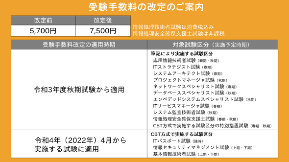 情報処理推進機構(IPA)は7月16日、ITパスポートなど12の試験から成る「情報処理技術者試験」と「情報処理安全確保支援士試験」の受験料を、5700円から7500円に値上げすると発表した。筆記で行う10試験については今秋から適用となる。新型コロナ対策や一部試験区分での「CBT」(コンピュータを使った試験方式)開始などによる、試験実施コストの増加を値上げの理由としている。