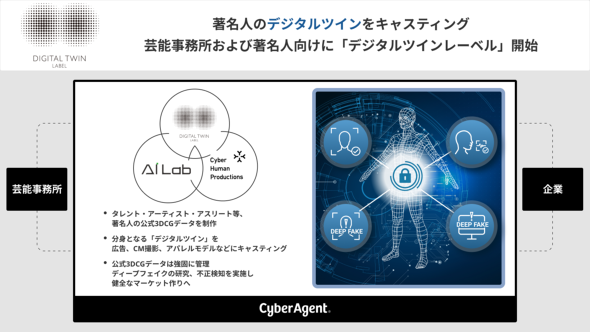 サイバーエージェントは8月2日、著名人の3DCGモデルを作成し、本人の代わりとしてバーチャル空間上のイベントや広告にキャスティングするサービス「デジタルツインレーベル」を始めた。著名人や芸能事務所の利用を見込み、2023年までに3DCGモデル500体の制作を目指す。