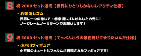 さらに2000セット、3000セットにも追加特典があり、最後には主人公・小戸川の「キュートなフォルム」を再現したフィギュアが付く。ポニーキャニオンは「応援の輪が大きくなるほどプロジェクトが加速するスペシャルな企画」としている。申し込みの受け付けは9月末まで。