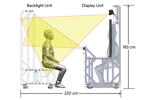 Project starlineの最大の特徴は、VR/AR空間ではなくビデオ会議の延長線上として、平面ディスプレイを採用している点だろう。HMDやヘッドフォンを装着する不快感を排除し、従来の物理的な会議のような自然体で参加できる。椅子は固定されており、目の高さが合うように両者が着席した状態で使用する。自分と相手の目の間の距離は、個人的な空間と社会的な空間の境界線上にある1.25mとしている。