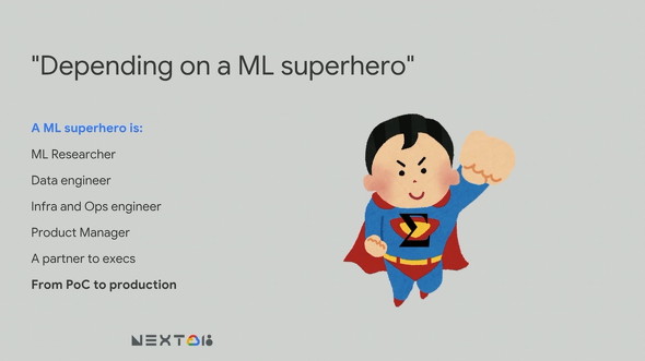 計算資源の用意やデータの準備、モデルのトレーニング、概念実証から実運用まで一貫してできるスキルセットを持つ“スーパーヒーロー”がいても、システムをスケールするには同じようなスーパーヒーローを何人も雇えるわけではない。