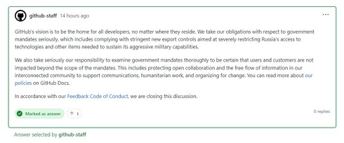 この投稿に対して、他ユーザーからは「GitHubを制限すれば、ロシア大統領も影響を受けて考えを改めるのだろうか?」や「一国の国民全員が、政府の行動に賛同しているわけではない」「国民全体を罰することが平和をもたらすと考えているなら、少し歴史を読んでみることをお勧めする」など、否定的な意見が多く見られていた。