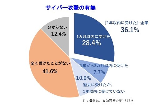 28.4%の国内企業が「1カ月以内にサイバー攻撃を受けた」と回答した──そんな調査結果を帝国データバンクが3月15日に発表した。3カ月から1年以内に攻撃を受けた企業は7.7%で、1年以内に攻撃を受けた企業は計36.1%になった。「全く受けたことがない」は41.6%だった。