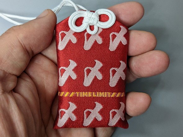 表面には大きく「〆」の文字がある。その下「TIME LIMIT」というフレーズは、どことなくアニメ「時をかける少女」の「Time waits for no one」をほうふつとさせるがおそらく関係はないこれらお守りは1個800円で、同神社の社務所で取り扱っている。この社務所は「アニメ聖地88カ所」のインフォメーションスポットにも指定されており、各種お守りと併せて、御朱印帳の販売も行われている。また御札や絵馬、おみくじなどもあるので、併せてチェックしたい。