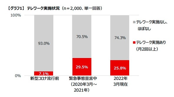 まずテレワークの実施状況だが、緊急事態宣言が頻発していた2020年3月から2021年までは、テレワーク実施が30%近くあった。現在では25.8%とやや減ったものの、テレワークが定着している様子が見て取れる。