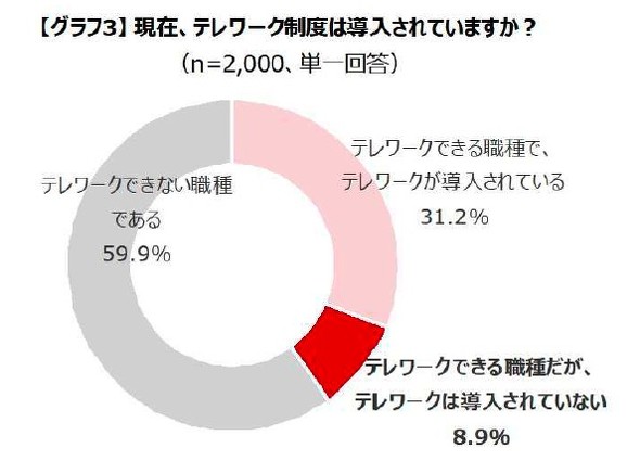 この数字を多いとみるか、少ないとみるかという話になると思うが、それにはそもそもテレワークできる職種かどうかが問題になる。今回の調査では、テレワークができない職種である方が約6割となっており、テレワーク可能な職種内で、導入・非導入の比率はおよそ7:2となっている。
