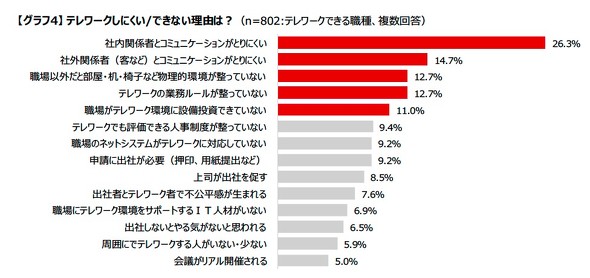 この調査では、テレワークしにくい、できない理由を、テレワークできる職種に限り調査した結果として、社内・社外とコミュニケーションがとりにくいという問題がクリアできていないこともあきらかになった。