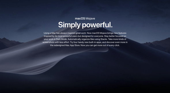 2018年のバージョン10.14モハヴェ(Mojave)は、4州にまたがる巨大なモハーヴェ砂漠から。ダークモードが一番の売りというのがなんとも地味すぎるアップデートだった。