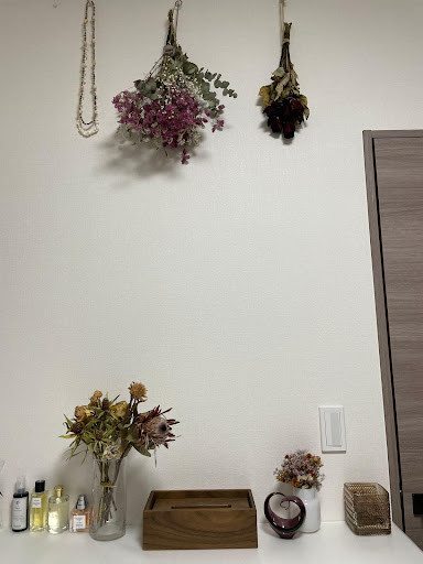 オンラインでも打ち合わせでは基本的に顔を出すようにしているので、外付けのカメラを導入したり背景になる場所を彩るなど工夫しています。壁に飾ってあるものは自作のドライフラワーが中心です。とても簡単に作れるのでおすすめです。