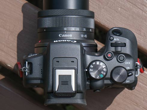 上面から見ると、EOS R7よりR6にそっくりなのが面白いところ。もちろんボディサイズも違うし、電源スイッチの位置も違う(R10の方が右手だけで基本操作ができて便利)けど、操作感としてはR6に合わせたんだろか。