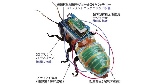 研究では、体長約6cmのマダガスカルゴキブリに着目。胸部背側に柔らかいバックパックを介し、曲面に沿って無線移動制御モジュールとリチウムポリマー電池を取り付けた。腹部背側には、ポリマーフィルム上に作製した厚さ4μm(=1000分の1mm)の太陽電池を搭載した。接着は繁殖環境(繁殖に適した高温多湿な環境)で1カ月間維持できたという。