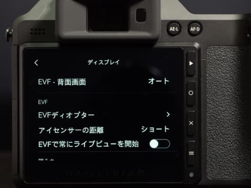 基本的に物理ボタンやダイヤルは最小限にというデザインが貫かれていて、感心したのは視度補正。なんと視度補正リングがないのである。これは困った、とメニューを見たら「ディスプレイ」設定に「EVFディオプター」(EVFの視度補正を指す)があり、それを使うと、電子ダイヤルで視度補正ができるのだ。ダイヤルを回すとファインダー内のレンズがクククッと動くのが分かる。