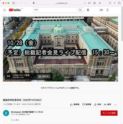 日本銀行は10月28日の金融政策決定会合の後に行う黒田東彦総裁の記者会見をライブ配信すると明らかにした。YouTubeの公式チャンネル「BOJchannel」で午後3時30分から配信を始める。