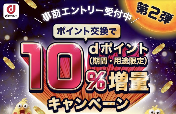 NTTドコモは11月1日から「ポイント交換でdポイント10%増量キャンペーン<第2弾>」を開催する。他社のポイントをdポイントに交換すると、10%増量して受け取れる。2023年1月1日まで。