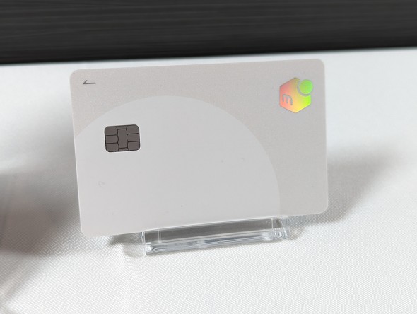 ちなみにメルカードのデザインはかなり攻めている。まずは表面から見てみよう。材質こそ普通のプラスチックだが、まず要素が極めて少ない。ICチップのほかはメルカリロゴ、そしてカードの向きを示す矢印だけだ。