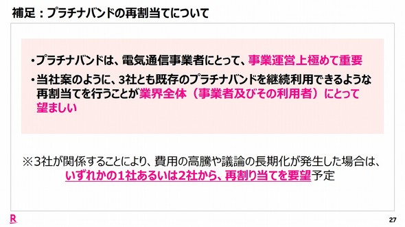 総務省「携帯電話用周波数の再割当てに係る円滑な移行に関するタスクフォース」第12回会合資料より。携帯3社はプラチナバンド再割り当てに必要な費用を750〜1150億円と見積もるが、報告書案ではそれらの費用を3社が全て負担しなければいけないこととなる実際、プラチナバンド再割り当ての議論で強硬な姿勢を見せていた楽天モバイルに対する、3社の不満は小さくないようだ。KDDI代表取締役社長の高橋誠氏は、2022年11月2日の決算会見で楽天モバイルに対し「言いすぎな所があると思う」と話しており、ソフトバンクの代表取締役社長執行役員兼CEOである宮川潤一氏も、2022年11月5日の決算会見でプラチナバンドを持たない楽天モバイルに理解を示す一方、再割り当ては既存顧客に与える影響が小さくないことから「少し地に足を付けた形でゆっくり会話できたら」と、やはり議論の姿勢に疑問を呈していた。