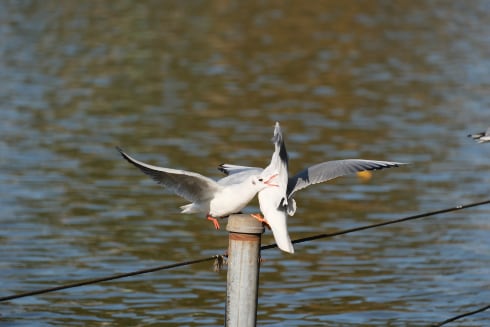 杭を争う2匹のユリカモメを高速連写した中の1枚。ピシッとフォーカスも来てる。動きを止めるために1/4000秒で(70-300mm 240mm 1/4000秒 F5.6 -1/3 ISO1000)