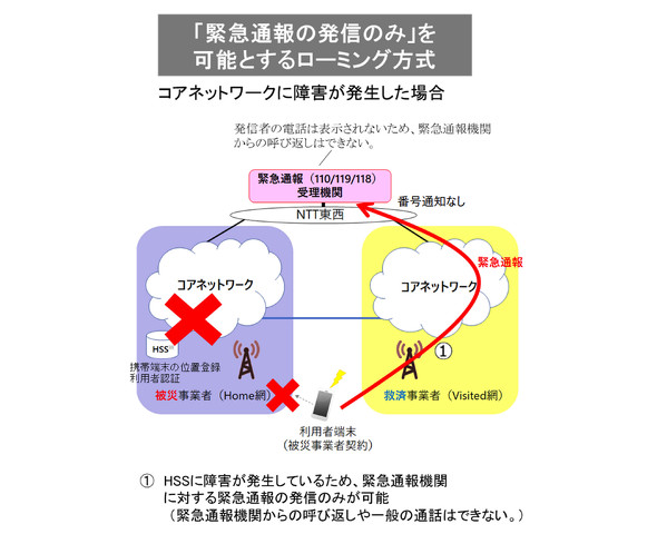 例えば、緊急通報の発信だけを可能とするローミング方式。HSSに障害が起こった場合、フルローミング方式によるローミングはできないが、携帯電話からの緊急通報の発信のみ可能とするローミングは実現できる可能性がある。