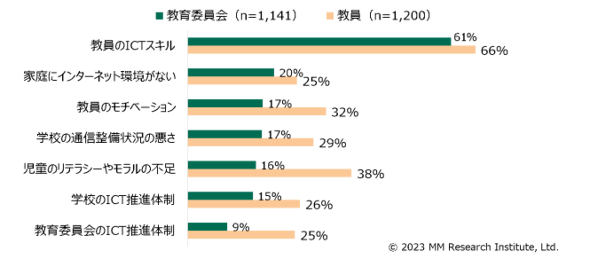 教員にも同様の質問をしたところ、「教員のICTスキル」(61%)がトップに変わりないが、それ以降に違いがあった。2位は「児童のリテラシーやモラル不足」(38%)、3位は「教員のモチベーション」(32%)だったという。