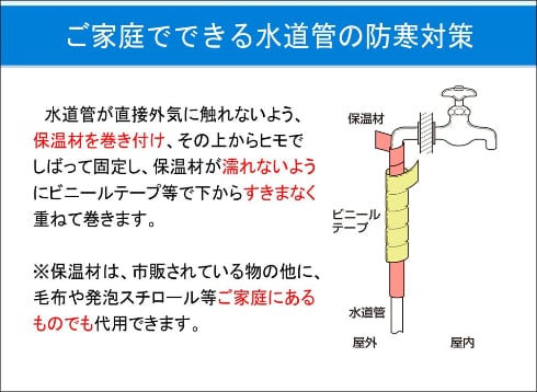 気温が氷点下を下回ると水道管の中の水が凍り、水が出なくなったり、最悪の場合水道管が破裂したりする恐れがある。水栓やメーターボックス内の止水栓などの保温、お風呂の蛇口のみ少量の水を出し続けておくといった事前の対策が有効。