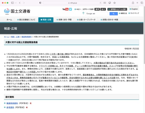 国土交通省は大雪の地域に向けて「不要不急の外出」を避けるように呼びかけた。やむを得ず自動車を運転する場合でもスタッドレスタイヤなど冬用タイヤの装着やチェーンの携行、スタックした時のためにスコップや砂などを持っておくことを求めている。