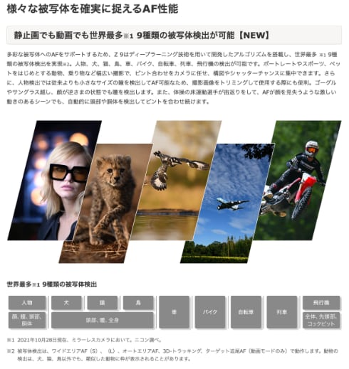 人体の検出や顔検出、瞳検出までは数年前に出そろい、その後、動物検出、鳥検出と来て、Z 9に至ってはさらに、車・バイク・自転車・列車・飛行機と全9種類である。