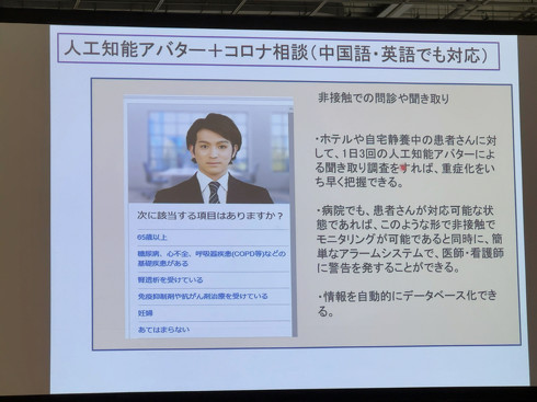 また、医療現場で記録する書類作成量も膨大なので、そこを音声入力できるだけで大幅に負担が減らせるという。例えば、血圧や心拍数などのバイタルチェックを音声入力にした病院では、作業時間が半分以下になったケースもあるという。他にも、コロナ相談をAIアバターのキャラクターに任せたところ抵抗感は少なく、むしろ聞きたいことを気にせず何度も聞き返せるので好印象だったという声もある。