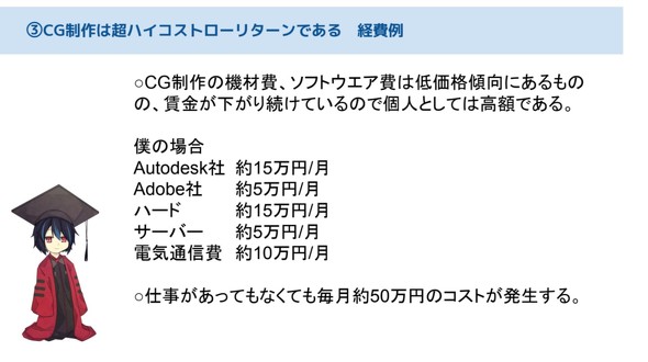 映像クリエイターのブンさんは、年収1000万円を超える課税事業者だが、コストが大きい(例えば、月固定費だけでAutodeskに約15万円、Adobeに約5万円、ハードに約15万円、サーバに約5万円、電気・通信費に約10万円……合計約50万円)上、テレビ局などの制作費用が年々減っているため予算はギリギリだ。インボイスが始まり、制作に参加してくれる免税事業者(俳優など)の消費税分を肩代わりすると、経営はさらに厳しくなる。